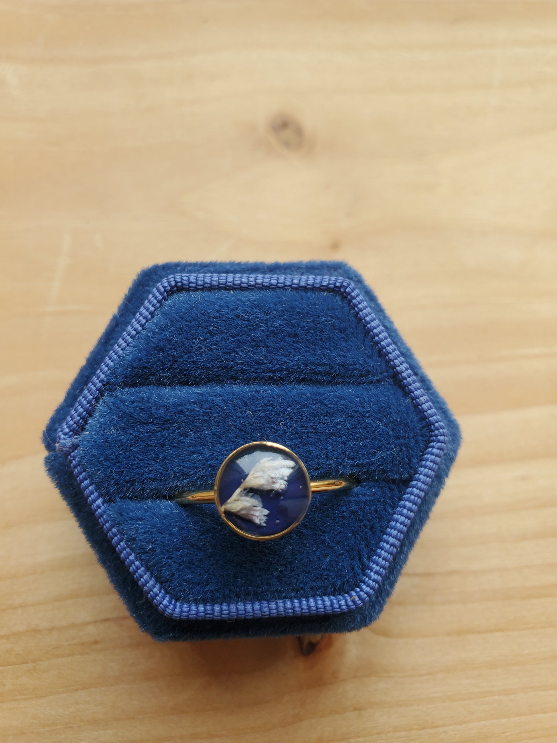 Bague ajustable en acier inoxydable avec véritable fleur intégrée dans la résine époxy.