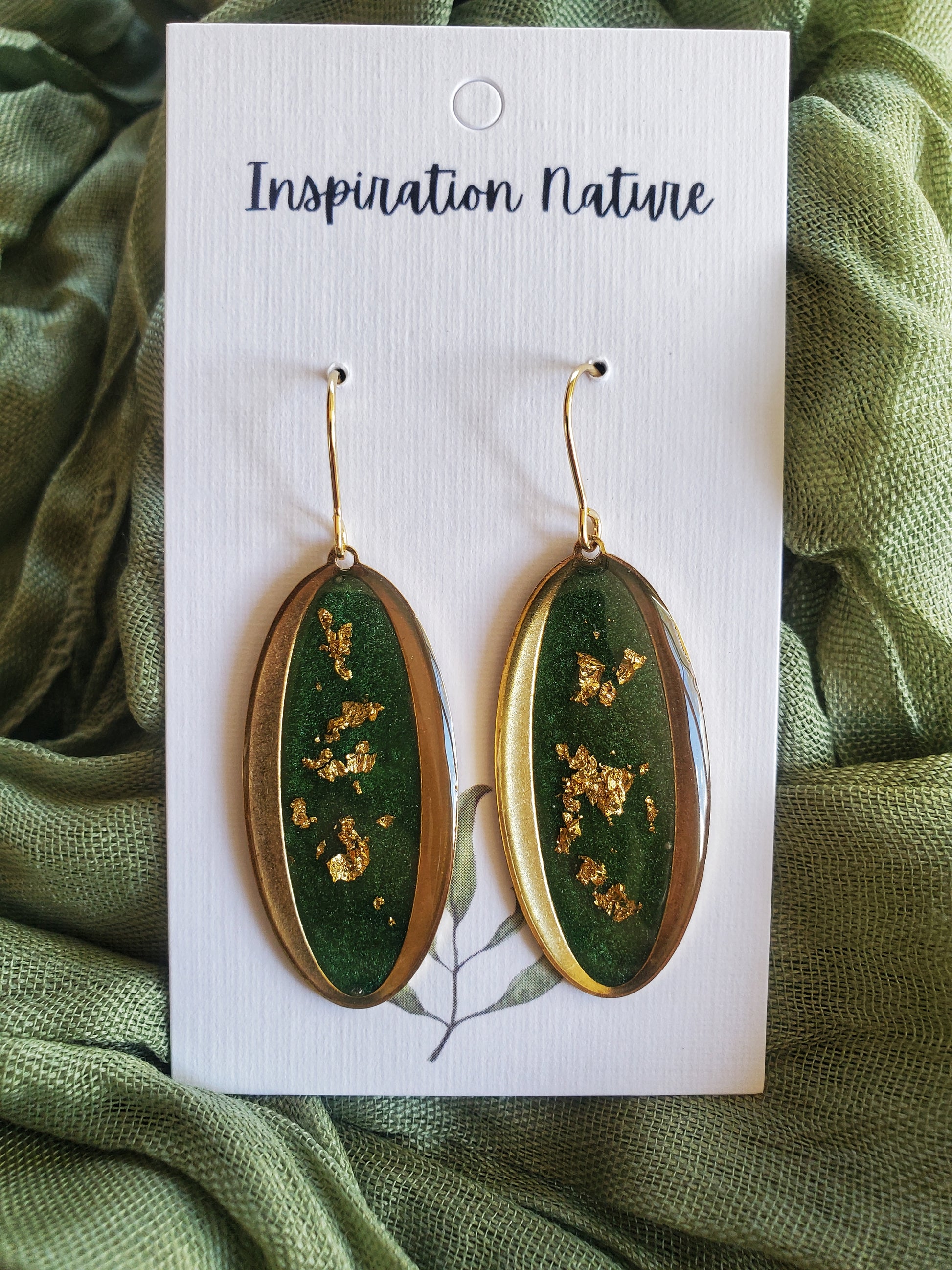 Résine, laiton, feuille d'or et crochets en acier inoxydable plaqué or 14k.