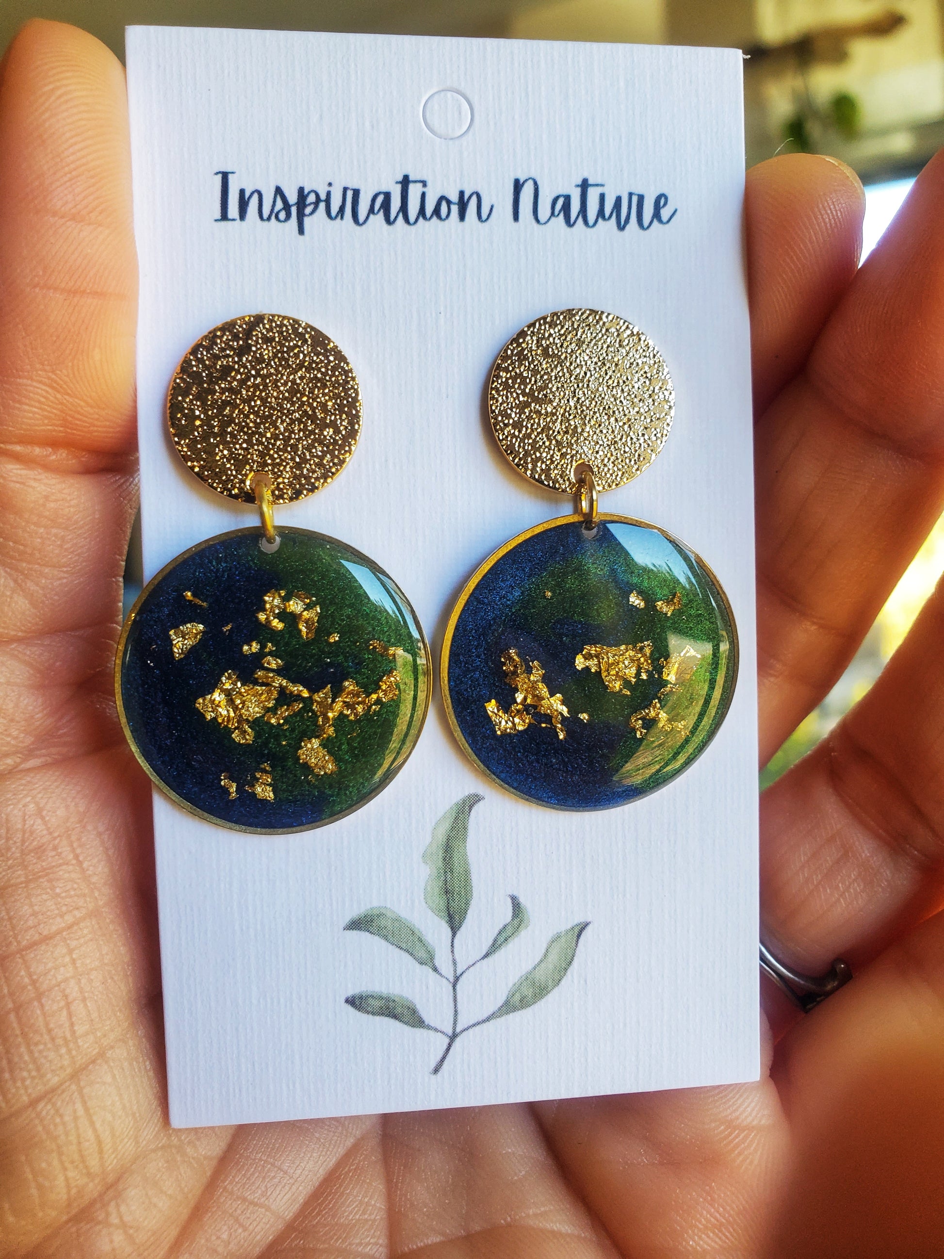 Résine, laiton, feuille d'or et crochets en acier inoxydable plaqué or 14k.