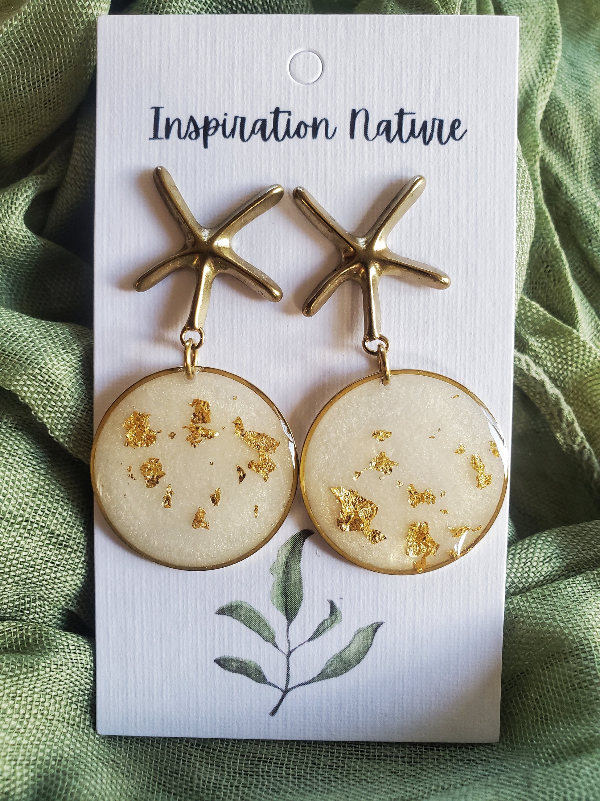 Résine, laiton, feuille d'or et crochets en acier inoxydable plaqué or 14k.