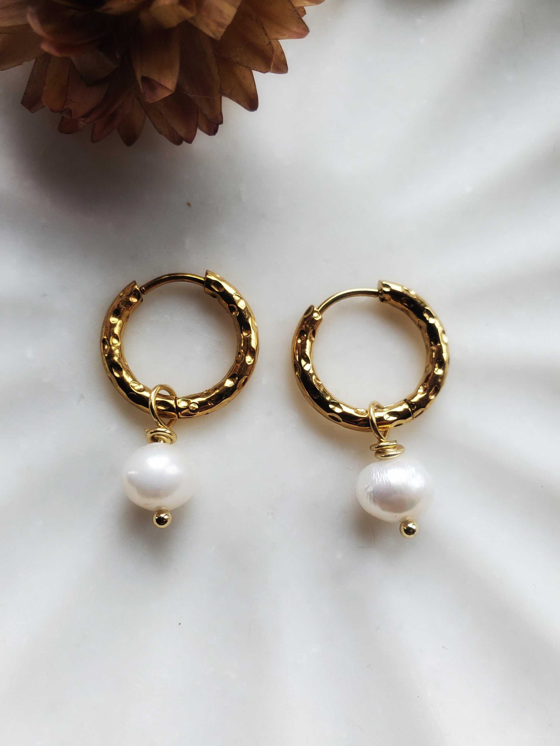 Anneaux en acier inoxydable doré et martelé avec perles blanches d'eau douce.