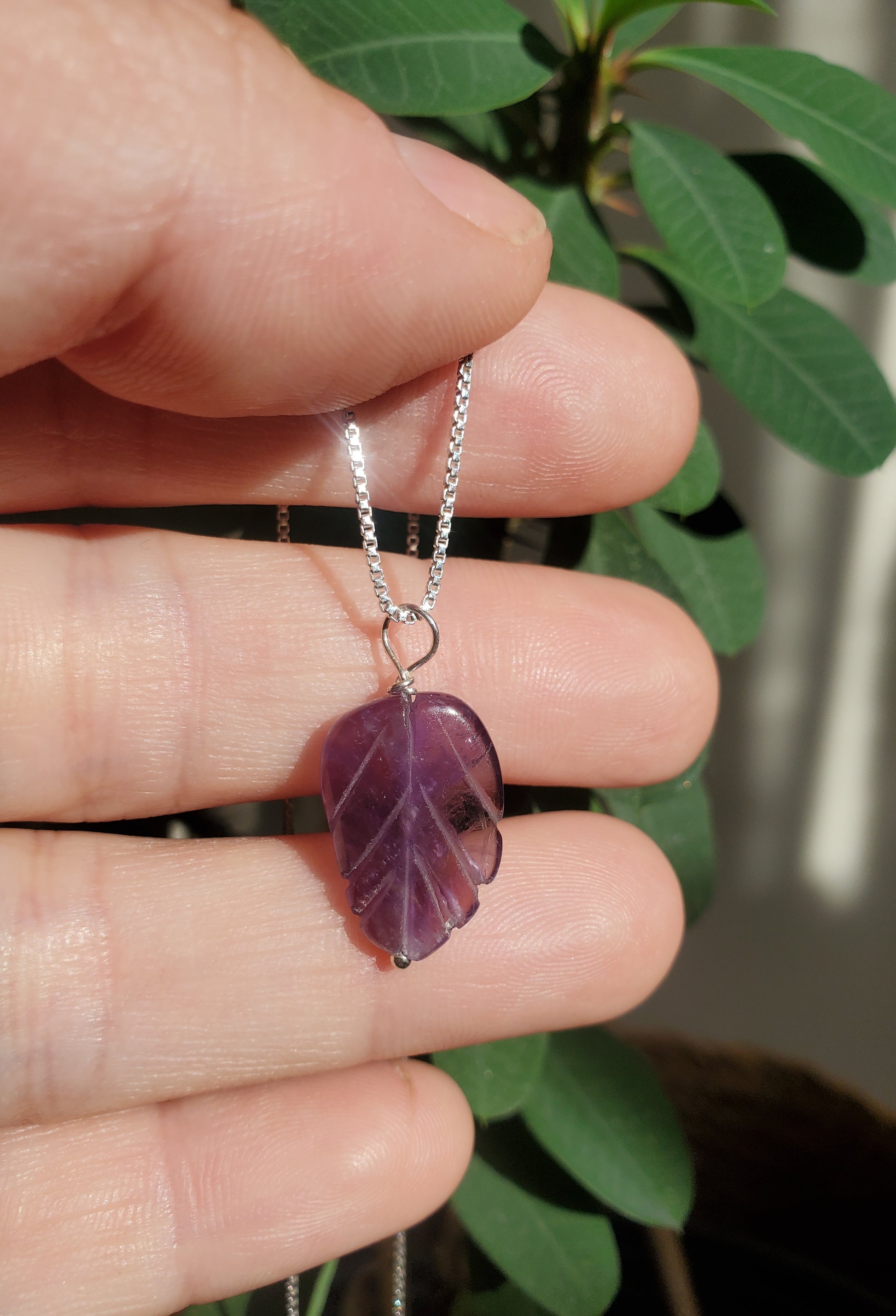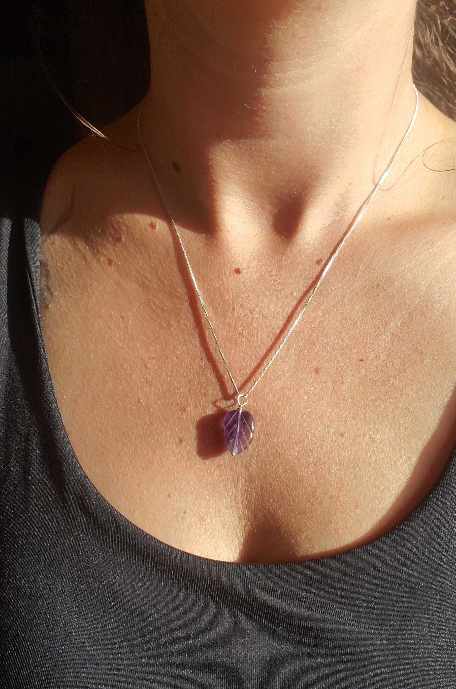 Chaine en argent sterling 925 avec pierre d'Améthyste sculptée en forme de feuille.