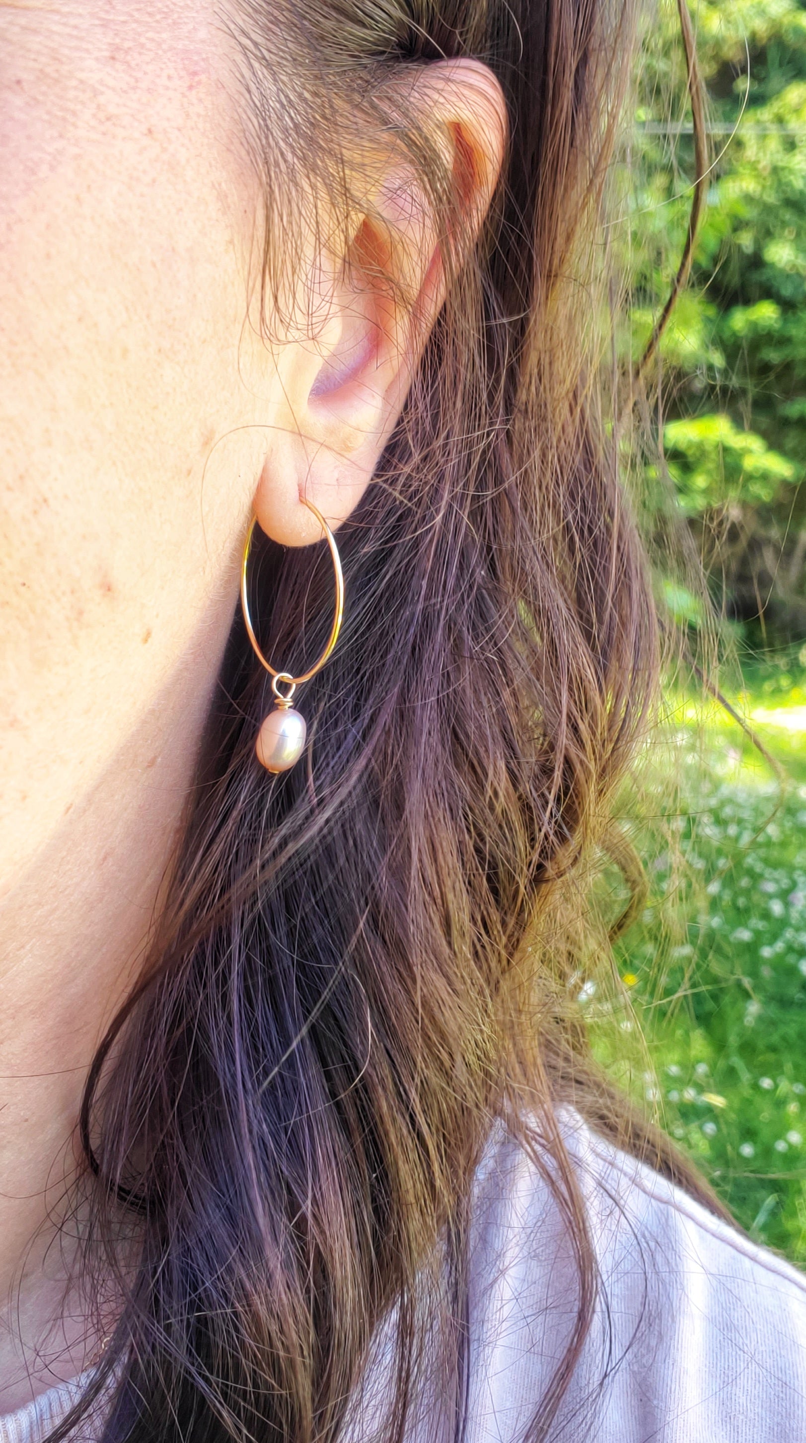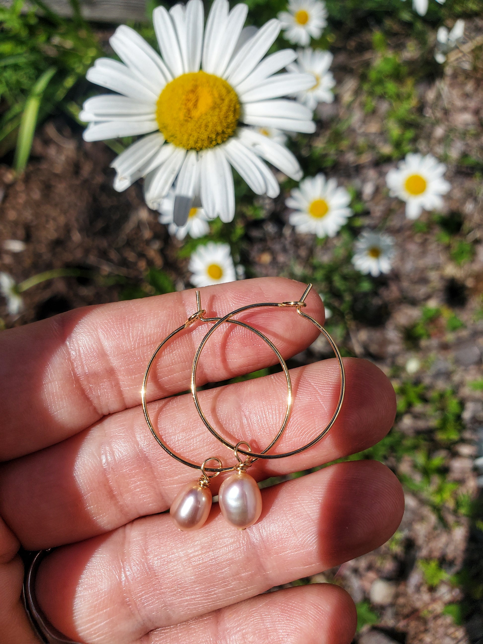 Petits anneaux minces et délicats en Goldfilled avec véritables perles d'eau douce rosées.