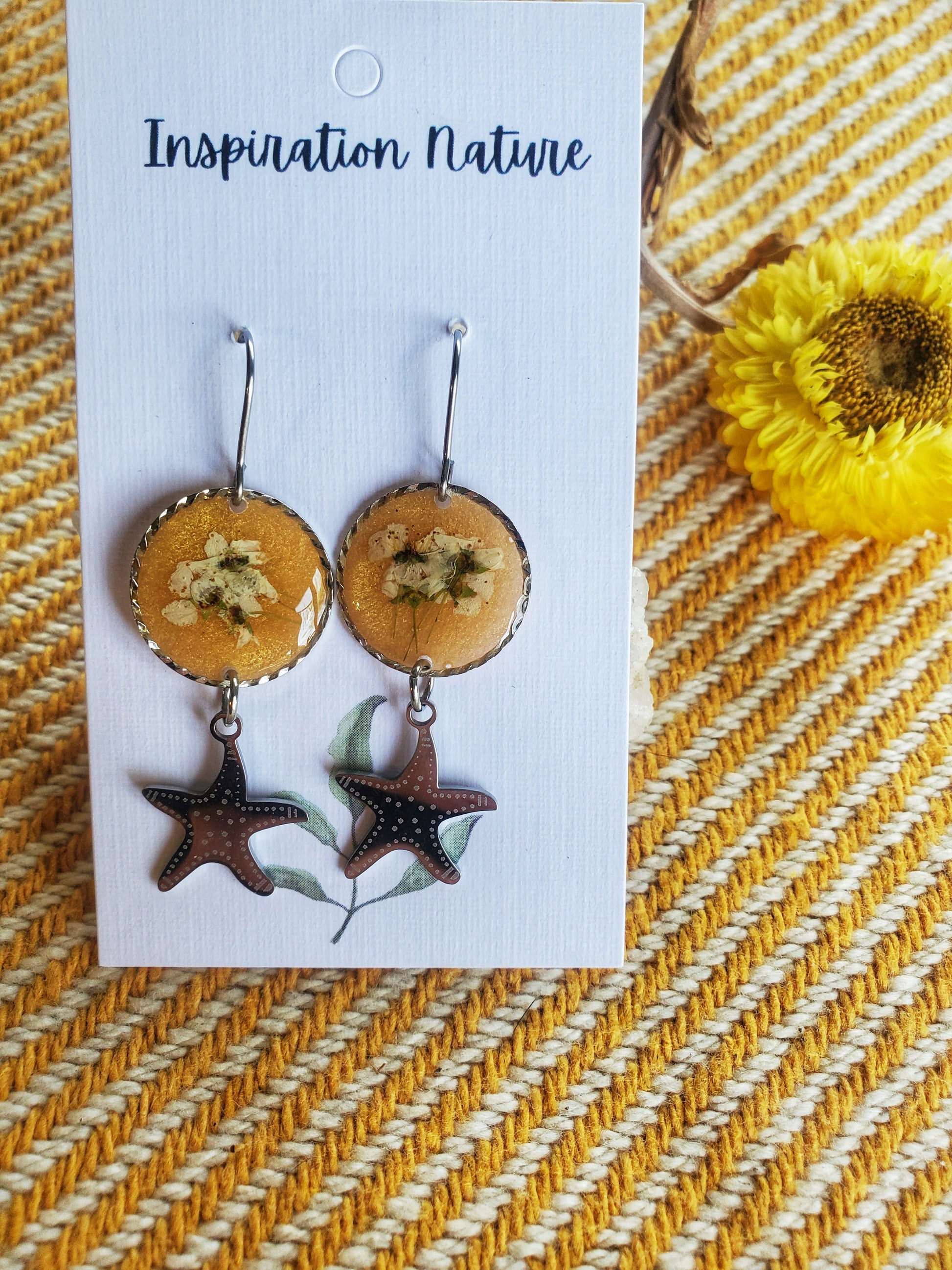 Boucles d'oreilles en acier inoxydable avec résine et fleurs séchées.