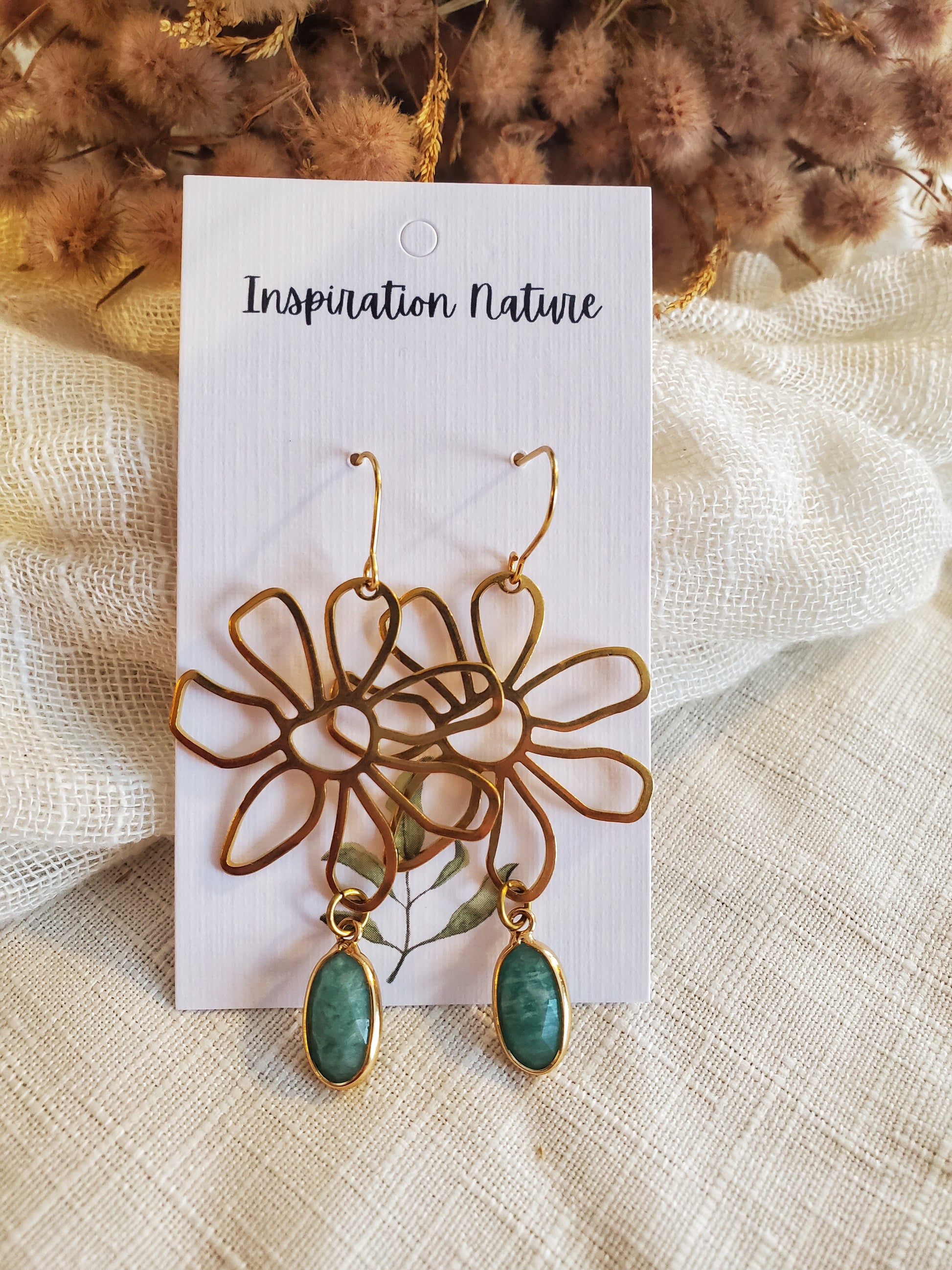 Boucles d'oreilles dorées en forme de fleur avec pierres d'Aventurine